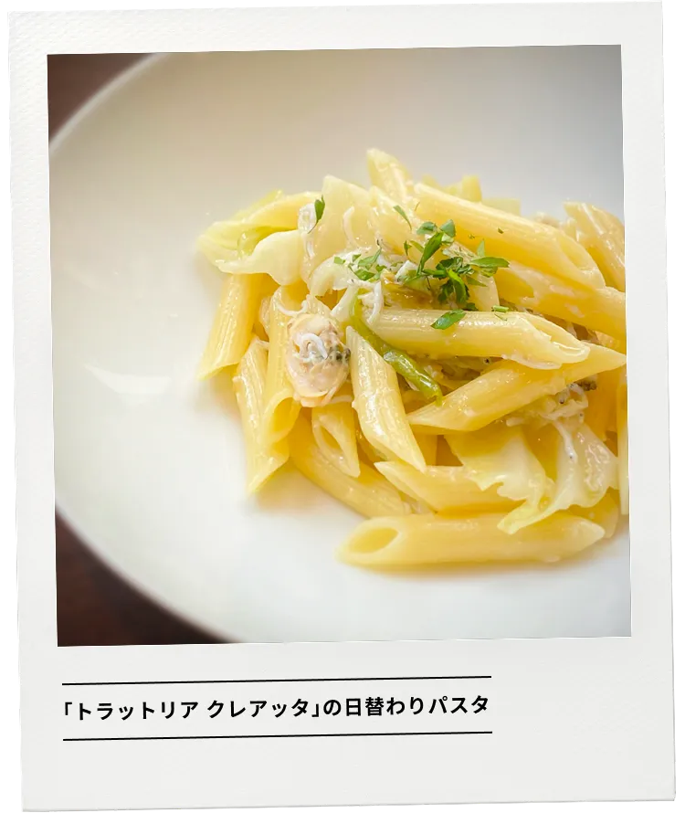会社のすぐ近くにある「TRATTORIA CREATTA(トラットリア クレアッタ)」の「本日の日替わりパスタ」が私の勝負メシ。先輩に連れてきてもらって以来、「ここぞ!」というときに訪れています。テラス席も素敵で、大手町の雰囲気が存分に味わえるお気に入りのお店です。